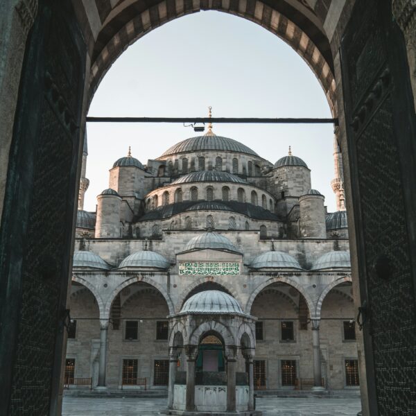 Die Sultan-Ahmed-Moschee, auch als Blaue Moschee bekannt, ist ein eindrucksvolles Beispiel osmanischer Architektur in Istanbul, Türkei. Bekannt für ihre sechs Minarette und die prächtigen blauen Fliesen im Inneren, ist sie ein bedeutendes Wahrzeichen der Stadt.